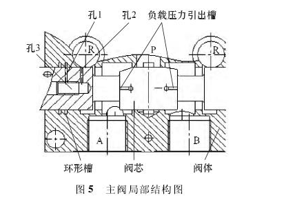某負載敏感比例多路閥主閥內部主要結構如圖5所示,閥芯處于中位時(shí),LS通過(guò)閥體上的流道被引入環(huán)形槽中,由于閥體上的環(huán)形槽與閥芯上的孔1孔2孔3和沉割槽與回油流道R相通,***后Ls被引入回油釋放掉。